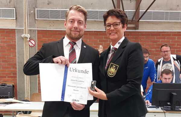 Julian Heuschötter vom MTV München erhielt im Rahmen der Bayerischen EM U15 in Moosburg die Ehrennadel in Bronze. Er unterstützt die bayerischen Kampfrichter seit dem Jahr 2010 und hat im Februar die Prüfung zur DJB-B-Lizenz bestanden. Beim Bavaria Cup in München wurde zudem Ralf Krüger vom ESV München Ost die bronzene Ehrennadel verliehen. Er ist seit 2018 als Kampfrichter aktiv und hat inzwischen die Landeslizenz.